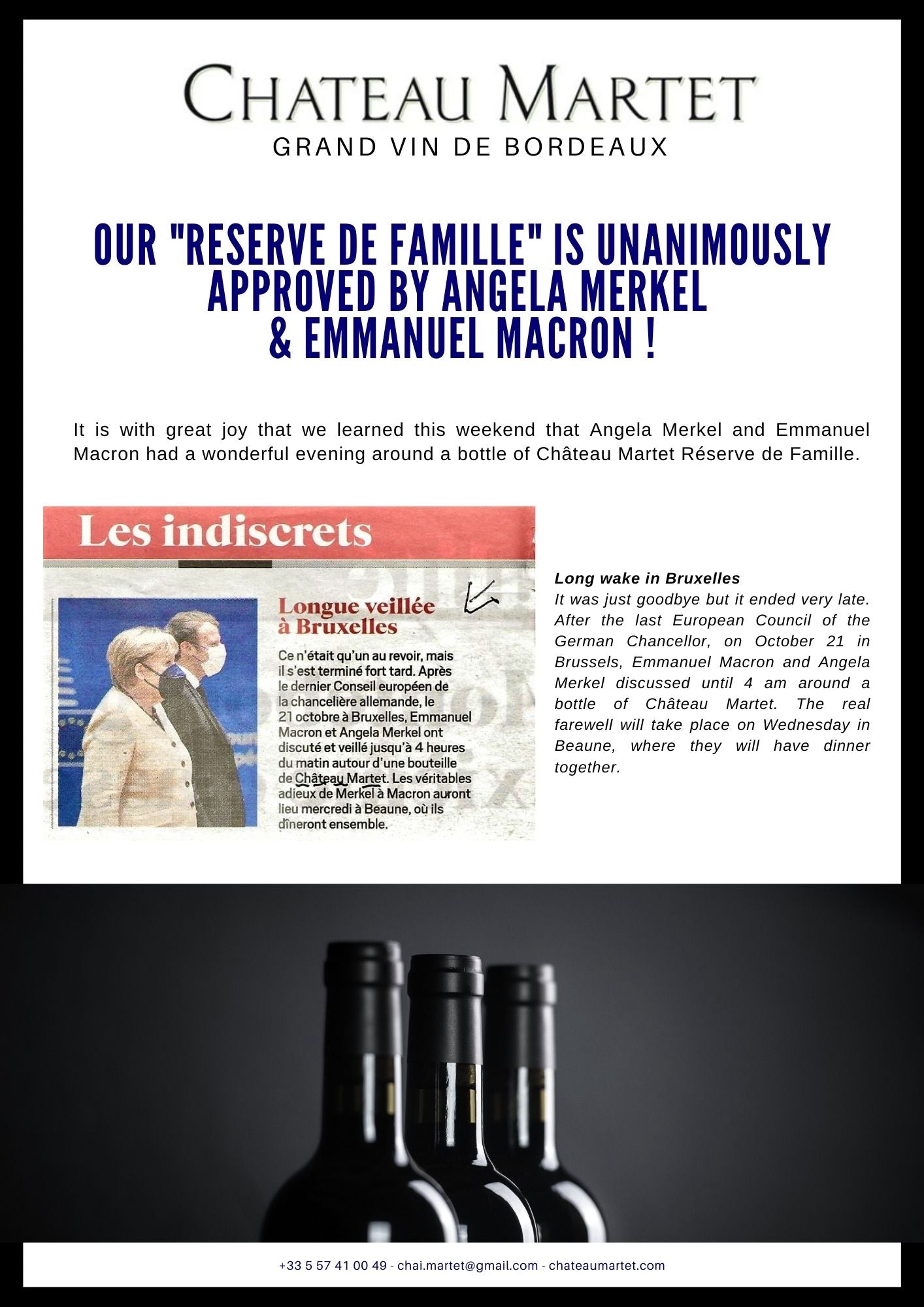"It was Angela Merkel's last European Council. The meeting, which brings together the heads of the 27 member states of the European Union, took place in Brussels, Belgium on Thursday October 21. Emmanuel Macron was present, and the two political figures pushed their discussions to 4 a.m., accompanied by a bottle of red wine, a Château Martets according to Le Journal du Dimanche, this October 31. Speaking toBFM TV, Emmanuel Macron answered questions about his relationship with Angela Merkel, and when asked if they were both in a positive confrontation, the President nodded in agreement, before going on to talk about the friendship between himself and his German colleague."
