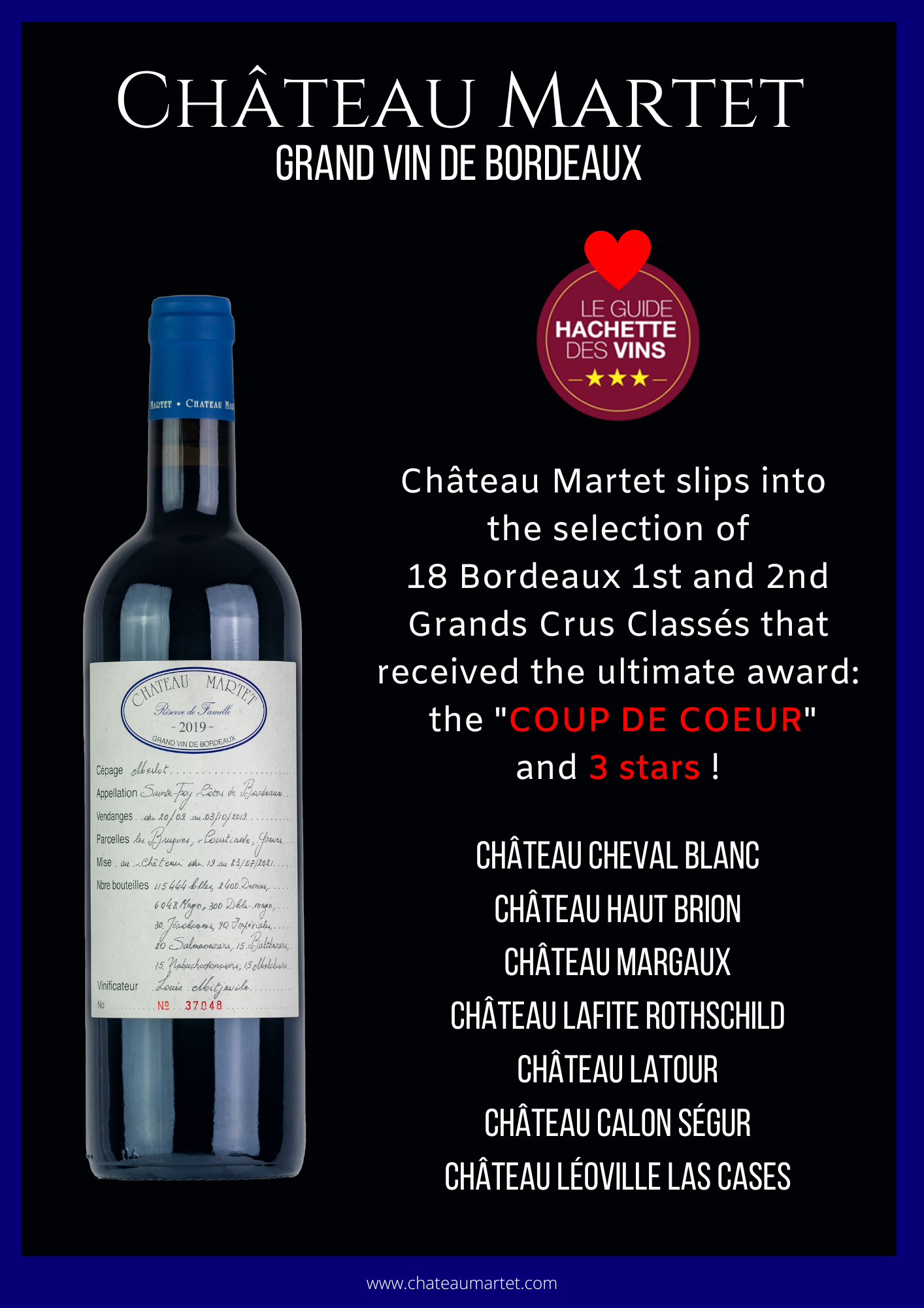 Château Martet is one of 18 Bordeaux 1st and 2nd Grands Crus Classés to receive the ultimate award: both Coup de Coeur and 3 stars !
