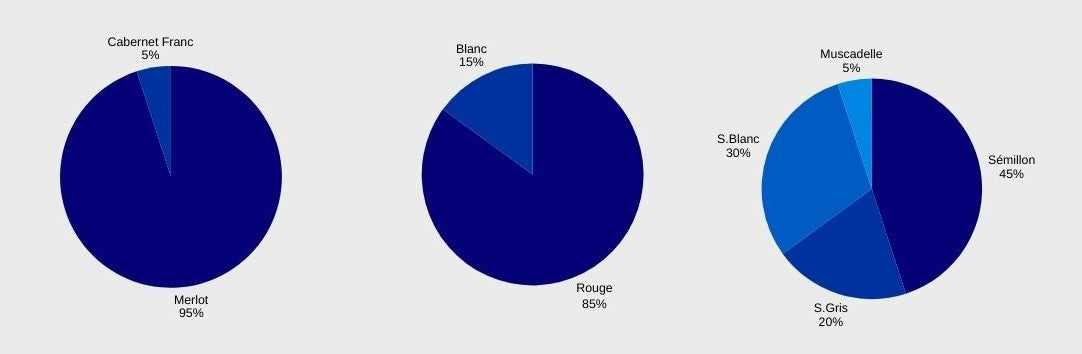 The soils of the appellation are clay-limestone and sandy-clay. The traditional Bordeaux grape varieties are used for both the reds (mostly Merlot, Cabernet Sauvignon and Cabernet Franc) and the whites (Semillon, Sauvignon, Muscadelle and Ugni Blanc).